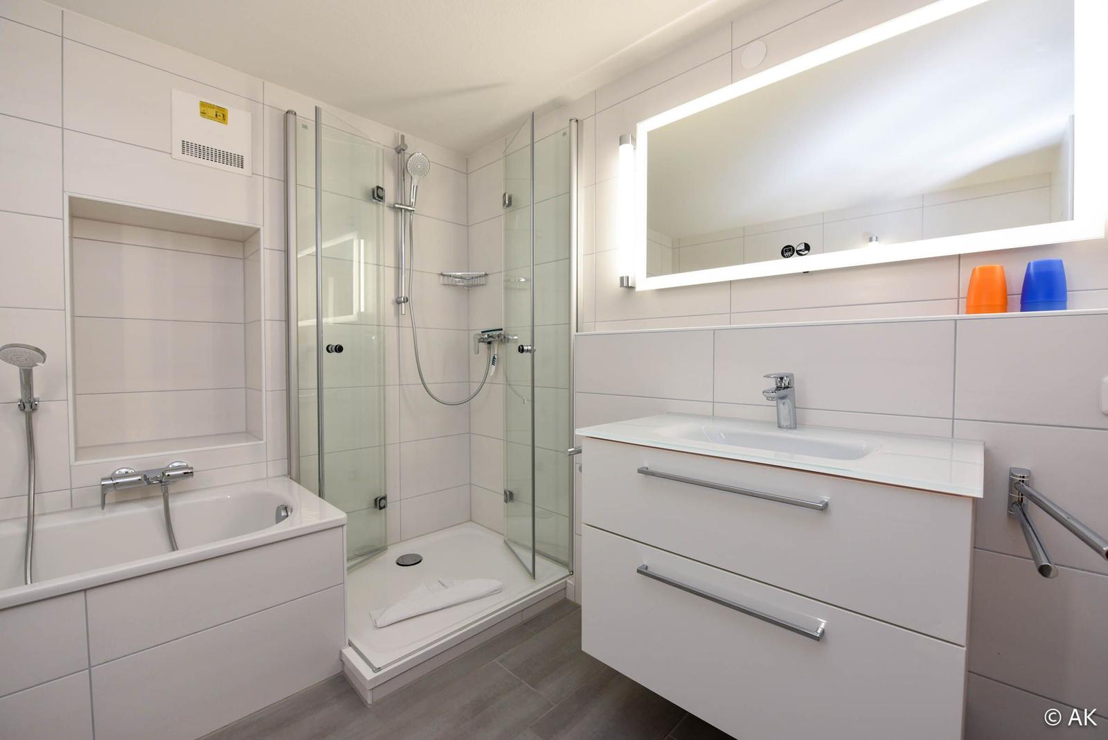 Diese einladende Ferienwohnung bietet perfekten Komfort für jeden Aufenthalt. Sie verfügt über ein modernes Schlafzimmer mit zwei Einzelbetten sowie ein helles Wohnschlafzimmer, das mit einer praktischen Schlafcouch ausgestattet ist. Die separate Küche ist ideal für Selbstversorger und enthält hochwertige Geräte wie einen Geschirrspüler, Elektro-/Gasherd, Backofen, Mikrowelle und Kühlschrank. Ein Wasserkocher und eine Kaffeemaschine sind ebenfalls vorhanden. Das geräumige Badezimmer bietet sowohl eine Dusche als auch eine Badewanne.