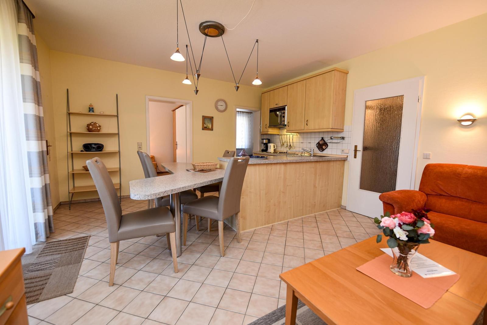 Die Ferienwohnung bietet eine komfortable und allergikergeeignete Unterkunft mit zwei Schlafzimmern, einem Badezimmer und einem Wohnschlafzimmer. In der offenen Küche findet sich eine umfangreiche Ausstattung, darunter ein Geschirrspüler, Elektro-/Gasherd, Mikrowelle, Kühlschrank, Kaffeemaschine, Wasserkocher und Toaster. Der Esstisch lädt zu geselligen Mahlzeiten ein.