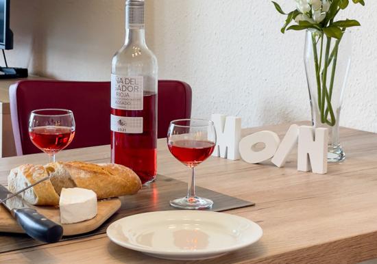 Die offene Küche ist mit hochwertigen Geräten ausgestattet, darunter ein Geschirrspüler, Elektro-/Gasherd, Backofen, Mikrowelle und Kühlschrank, sowie eine Kaffeemaschine, Toaster und Wasserkocher. Ein Esstisch lädt zu gemeinsamen Mahlzeiten ein.