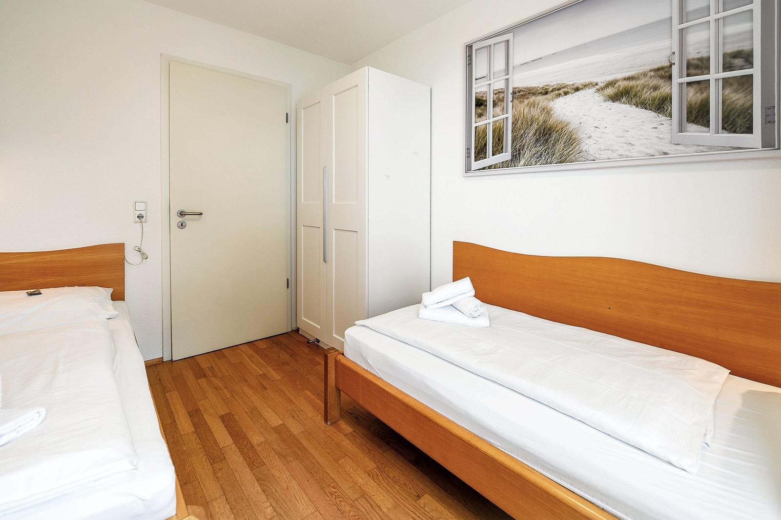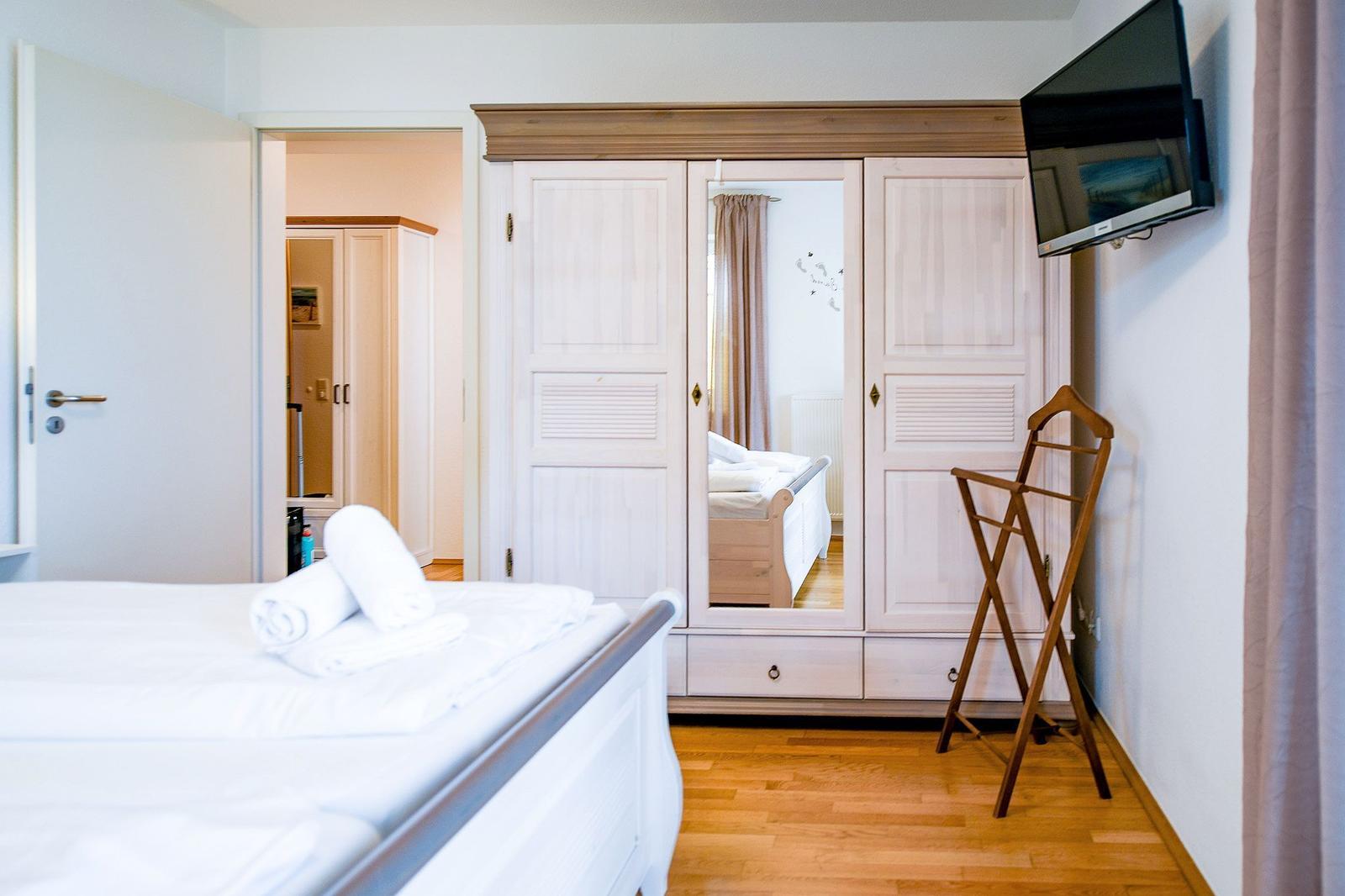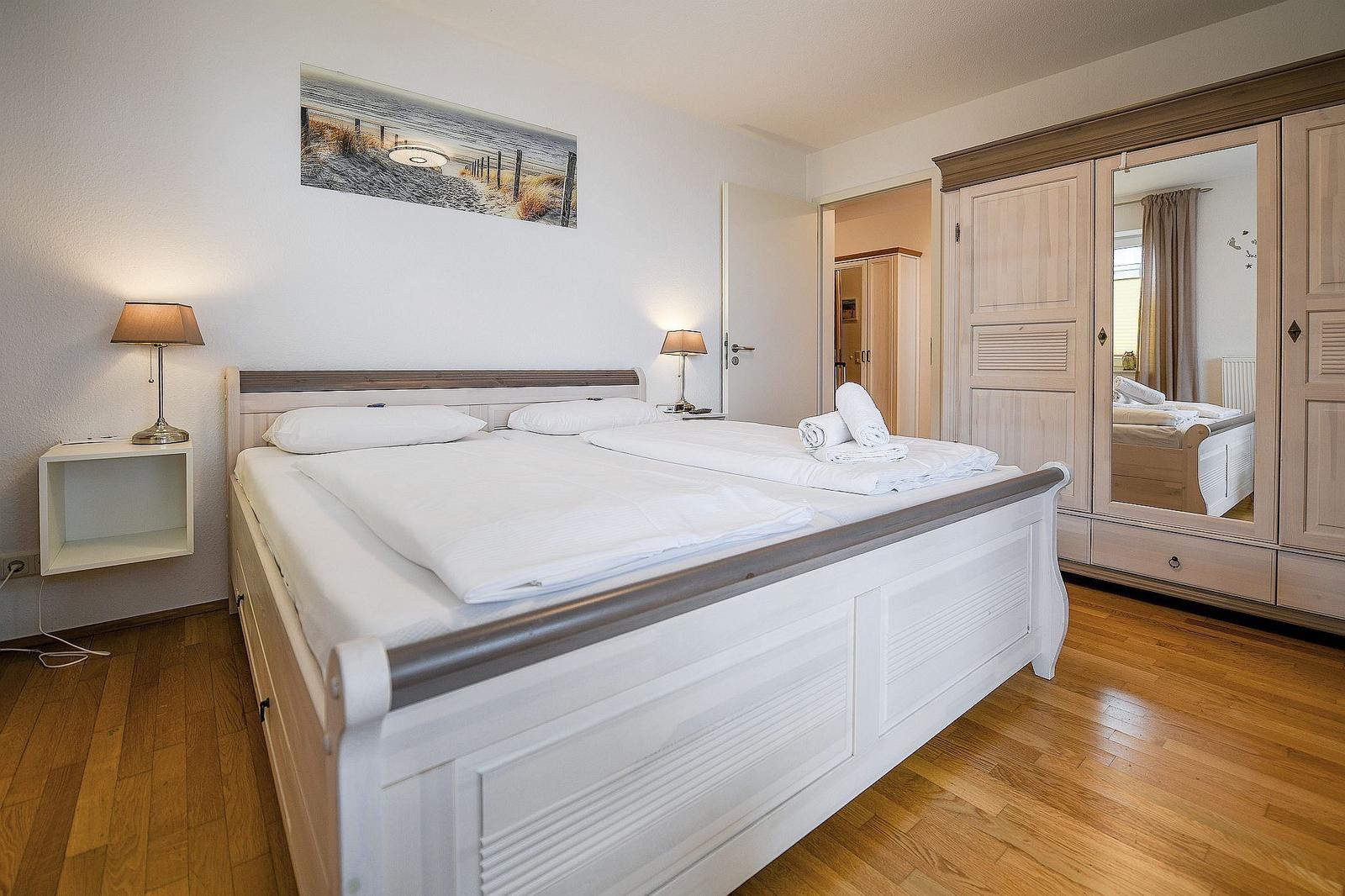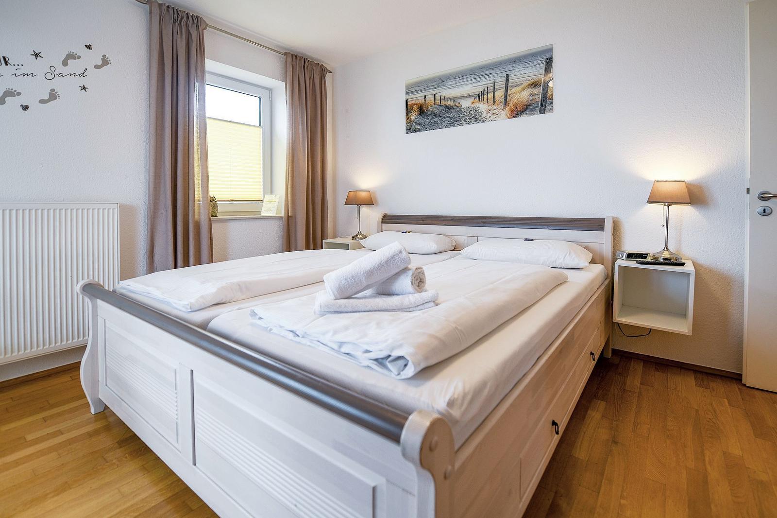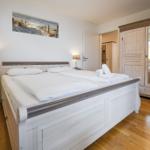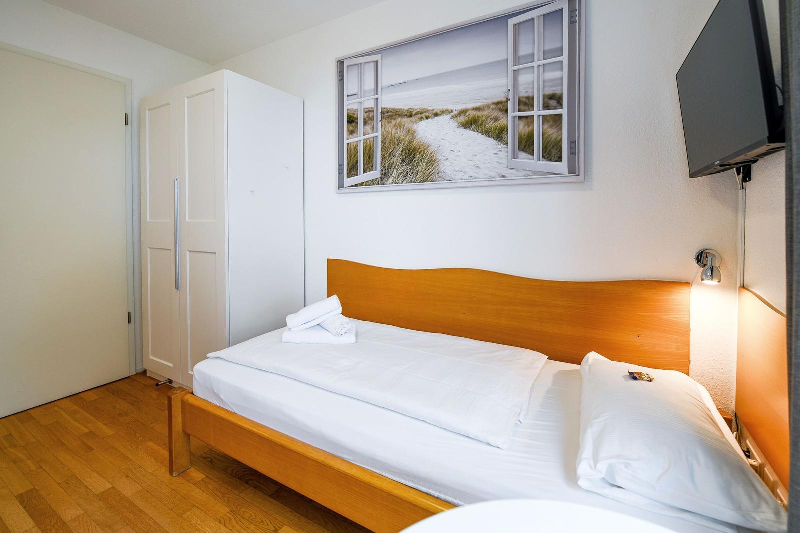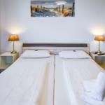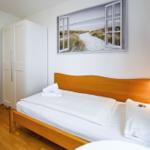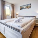 Die Ferienwohnung überzeugt durch eine moderne Ausstattung und ein großzügiges Raumkonzept. Sie bietet zwei Schlafzimmer, eines mit einem komfortablen Doppelbett und das andere mit zwei praktischen Einzelbetten, ideal für Familien oder Gruppen. Die offene Küche ist mit hochwertigen Geräten ausgestattet, darunter ein Elektro-/Gasherd, Backofen, Geschirrspüler und Mikrowelle. Ein Essbereich mit großem Esstisch lädt zum gemeinsamen Verweilen ein.