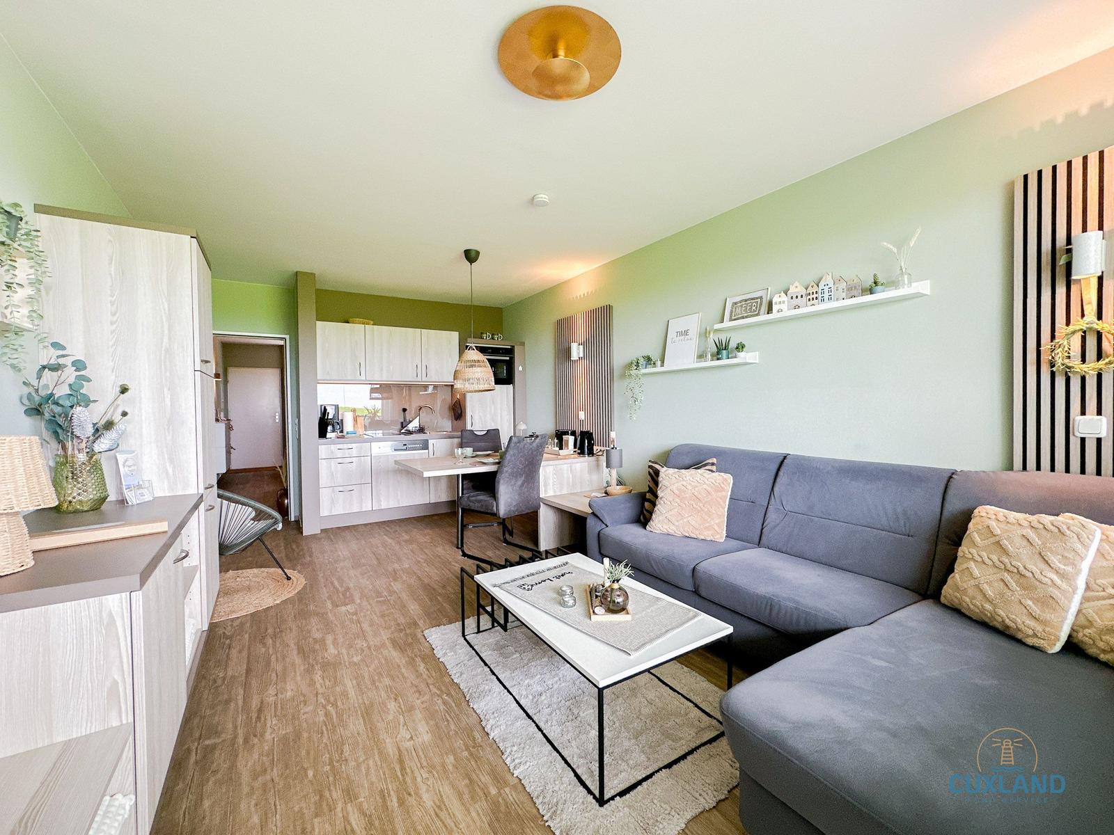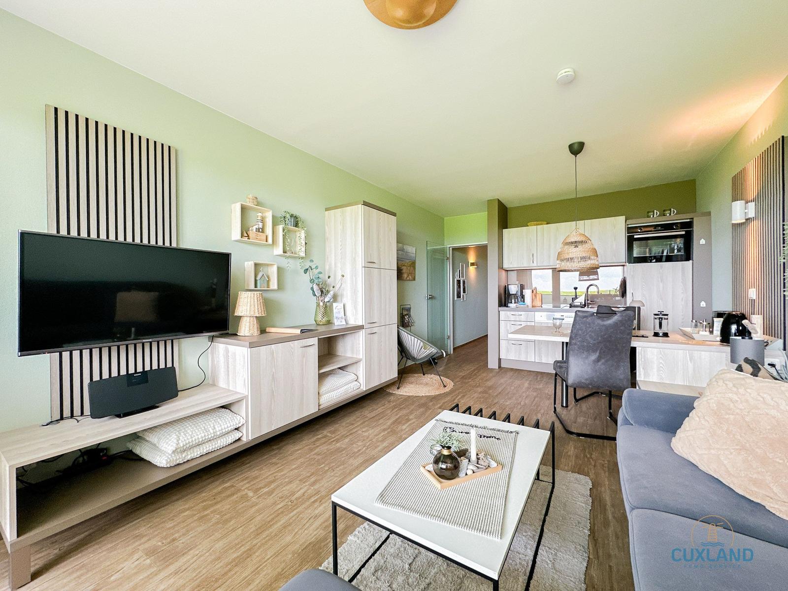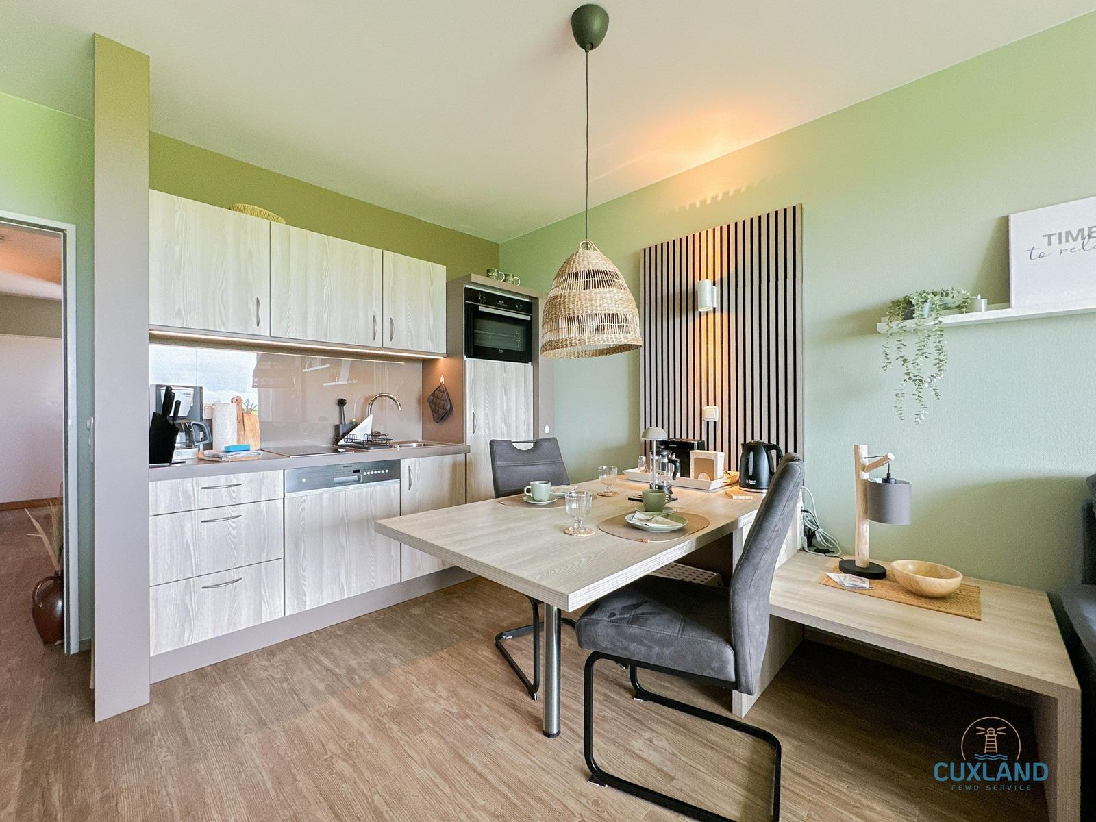 Die Ferienwohnung bietet eine moderne und komfortable Umgebung für einen erholsamen Aufenthalt. Sie verfügt über ein Schlafzimmer mit einem gemütlichen Doppelbett, das ideal für Paare geeignet ist. Die offene Küche ist mit hochwertigen Geräten ausgestattet, darunter ein Elektro-/Gasherd, Backofen, Geschirrspüler und Kühlschrank, um das Kochen zum Vergnügen zu machen.