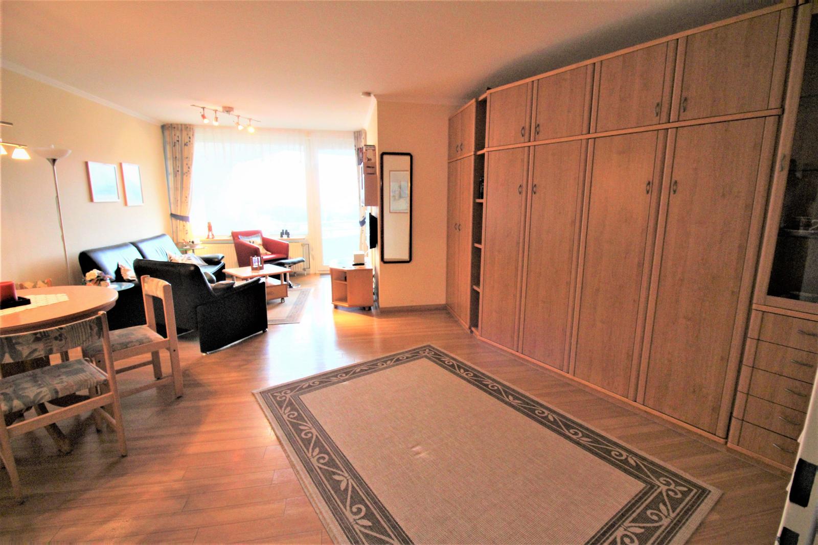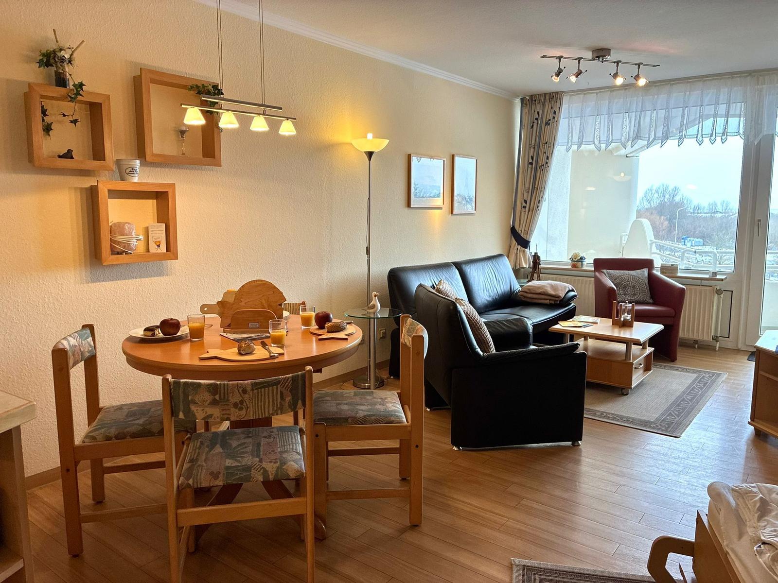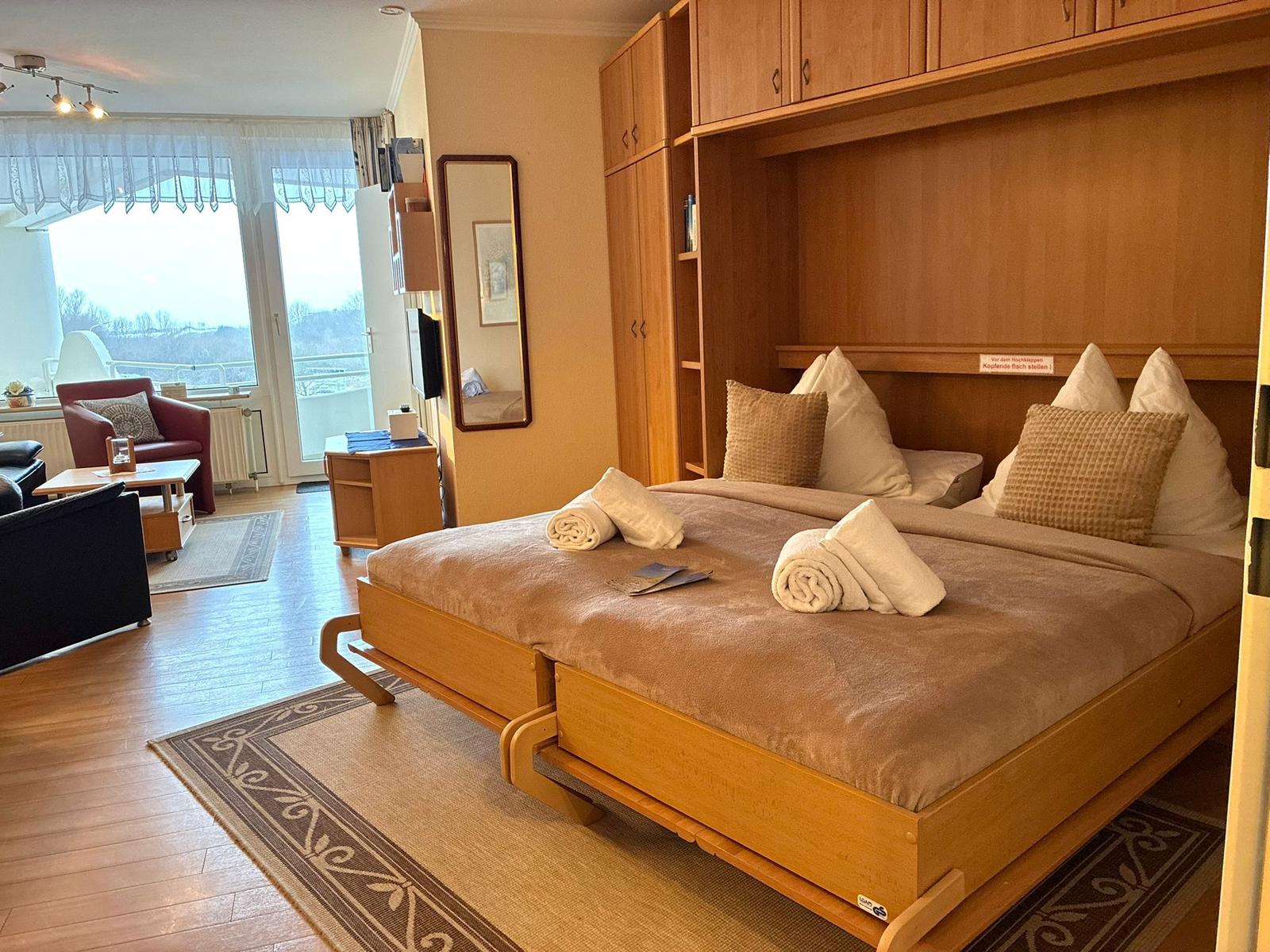 Im Wohn-/Schlazimmer gibt es zwei Schranklappbetten, eine gemütliche Sitzecke mit schönen Ausblick und eine Essecke.