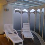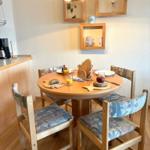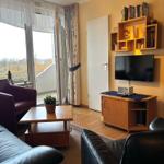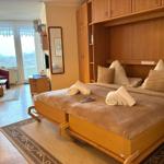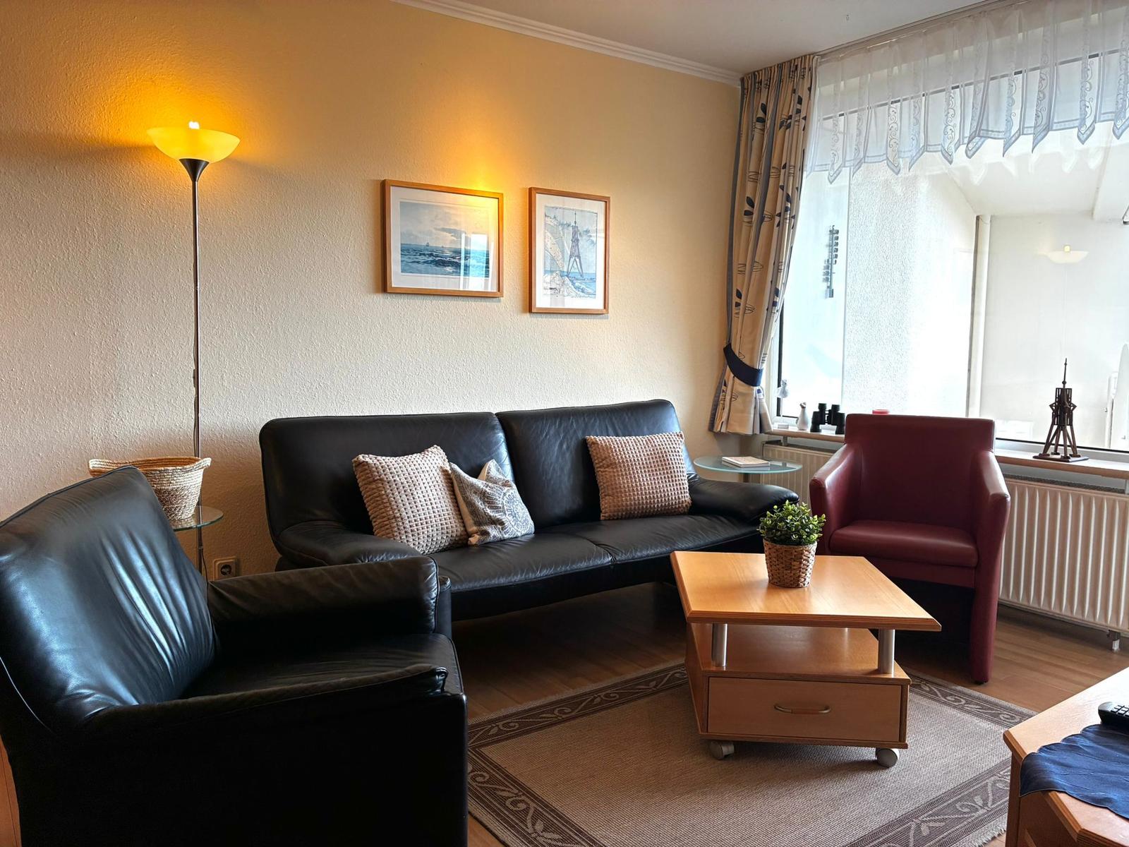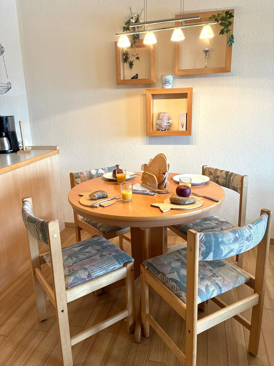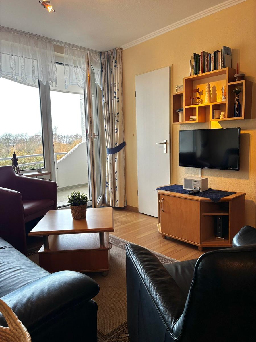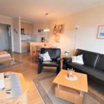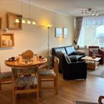 Im Wohn-/Schlazimmer gibt es zwei Schranklappbetten, eine gemütliche Sitzecke mit schönen Ausblick und eine Essecke.